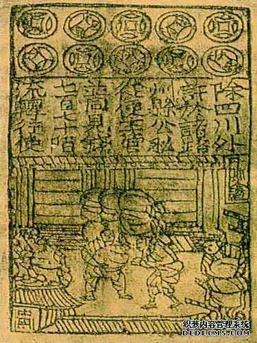 交子图案“用屋木人物”组成,外做花纹边框,图形复杂,造假者不易摹仿。后来,又用红、蓝、黑等色,套印花纹图案及官方印章,这大约就是双色及多色套印的开始——图案防伪法。